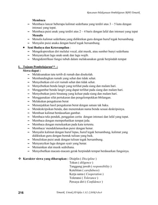 Dokumen ini adalah Rencana Pelaksanaan Pembelajaran (RPP) tematik untuk siswa kelas 1, mencakup tema permainan dengan alokasi waktu 3 minggu. RPP ini menetapkan standar kompetensi di berbagai mata pelajaran seperti PKn, IPS, IPA, Matematika, dan Bahasa Indonesia, serta mencakup tujuan pembelajaran dan karakter siswa yang diharapkan. Metode pembelajaran yang digunakan meliputi ceramah, diskusi, tanya jawab, dan demonstrasi di berbagai kegiatan.