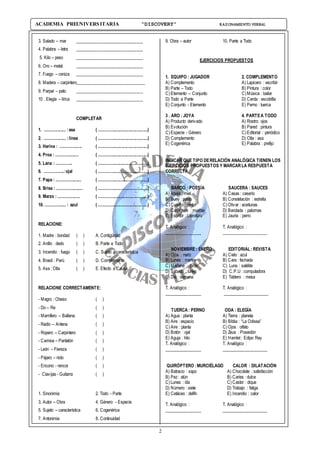 This document provides definitions and examples of analogies as used in reasoning exercises. It begins by defining an analogy as a relationship of similarity between two distinct things. It explains that analogy exercises require determining the type of analogical relationship presented in the premises and selecting the alternative that presents the same type of relationship.