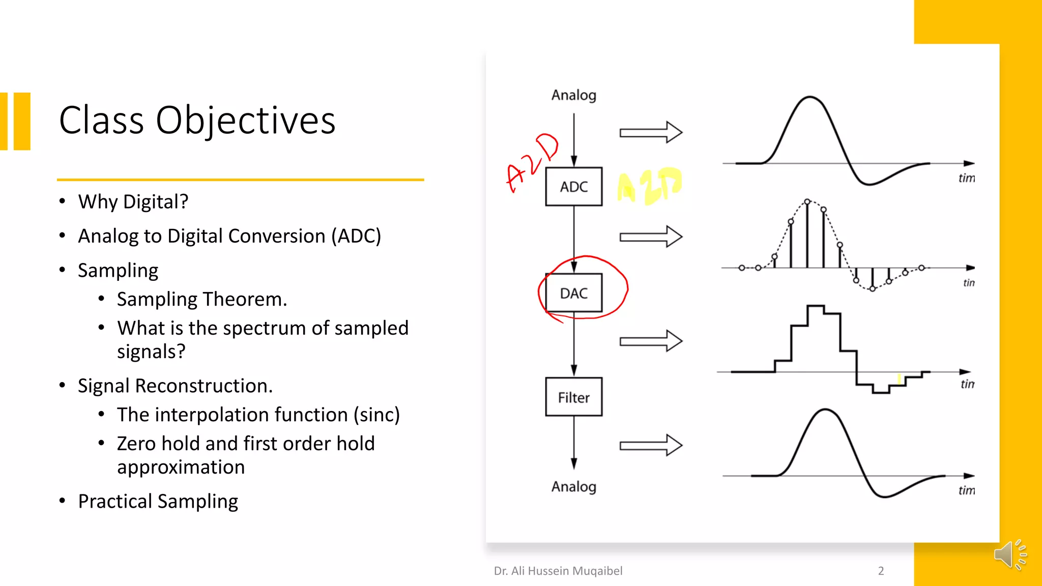 This document discusses analog to digital conversion and signal sampling and reconstruction. It begins by explaining the advantages of digital over analog communication and the process of analog to digital conversion using pulse code modulation. It then covers the sampling theorem, which states that a bandlimited signal can be reconstructed from samples taken at or above the Nyquist rate. The document provides the mathematical representations of sampling and discusses how the spectrum of a sampled signal consists of copies of the original spectrum spaced at integer multiples of the sampling frequency. It describes how reconstruction involves the use of an interpolation filter, such as the sinc function, to filter out copies and reconstruct the original signal from its samples. Finally, it discusses practical considerations in sampling and reconstruction.
