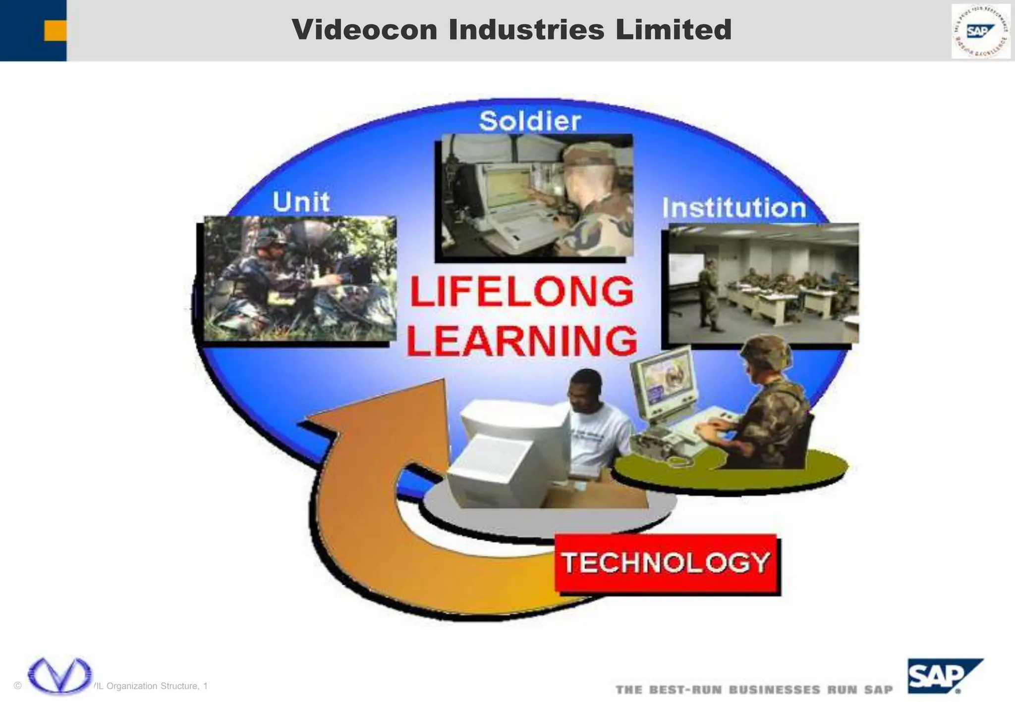 The document outlines the organizational structure and key components of the Sales and Distribution (SD) module within SAP for Videocon Industries Limited. It details internal and external organizational elements such as company codes, sales organizations, distribution channels, and the processes involved in sales order processing, customer master creation, and billing documentation. The training material is aimed at end-users to facilitate an understanding of the SD module's functionalities and business processes.