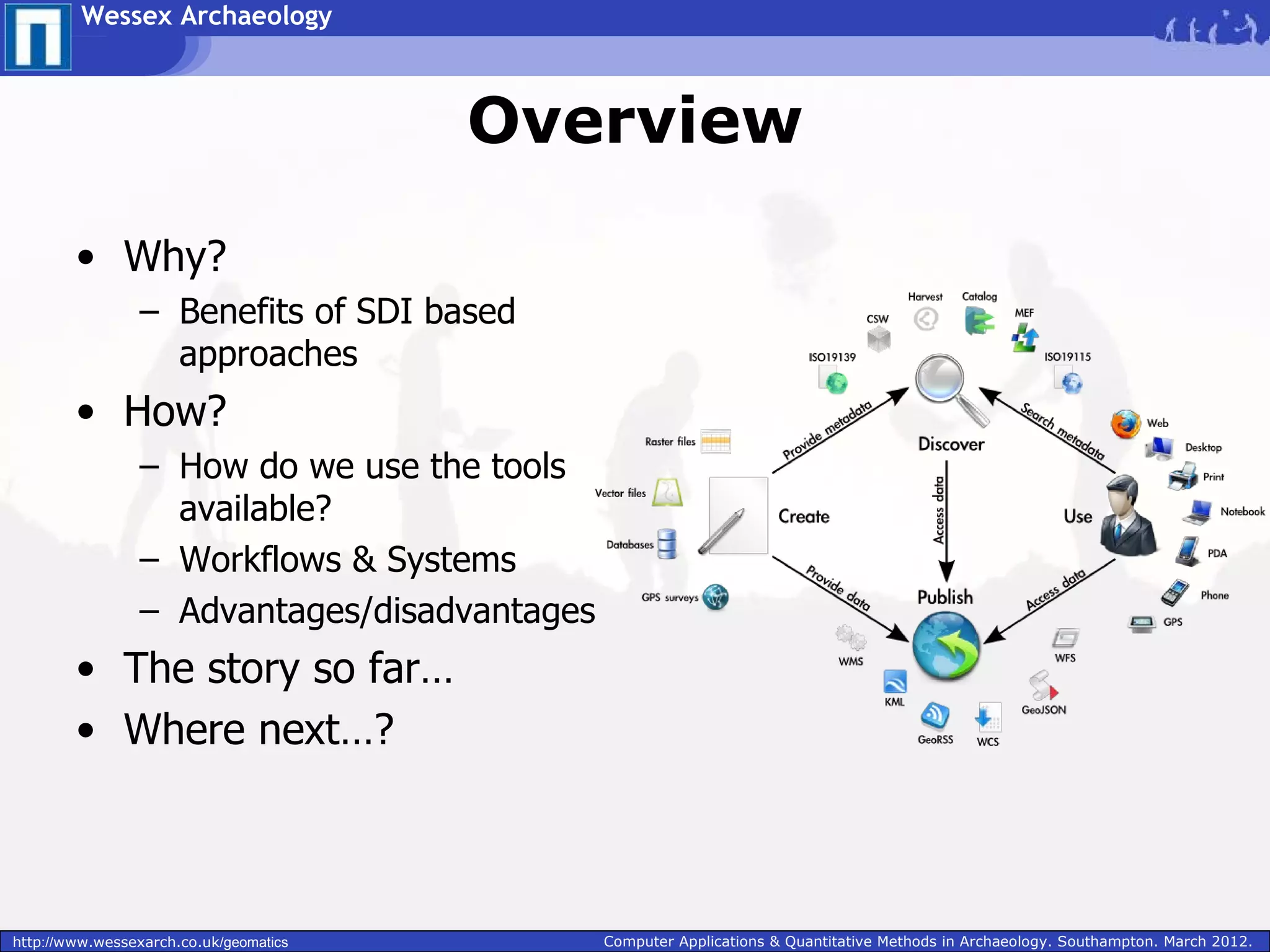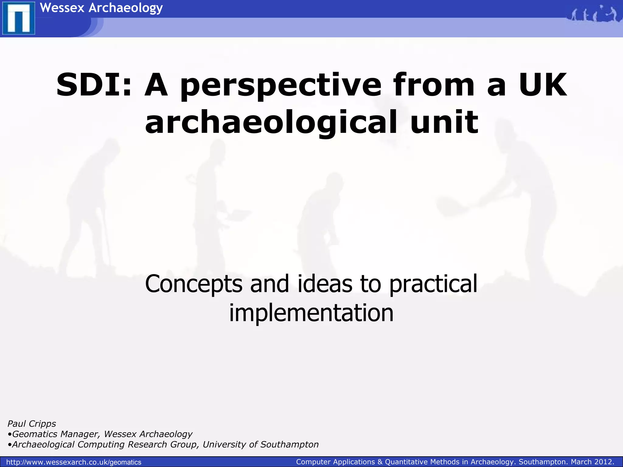 Wessex Archaeology is exploring the benefits of implementing a Spatial Data Infrastructure (SDI) to better manage their large volumes of spatial archaeological data. An SDI would improve data quality, accessibility, and efficiency by integrating disparate resources through common technology standards and policies. Wessex Archaeology has begun implementing an SDI using tools like ArcGIS, QGIS and GeoServer to capture, store, analyze and share spatial data both internally and with external partners and databases. Further adoption of SDI approaches across the heritage sector could maximize data sharing and reuse.