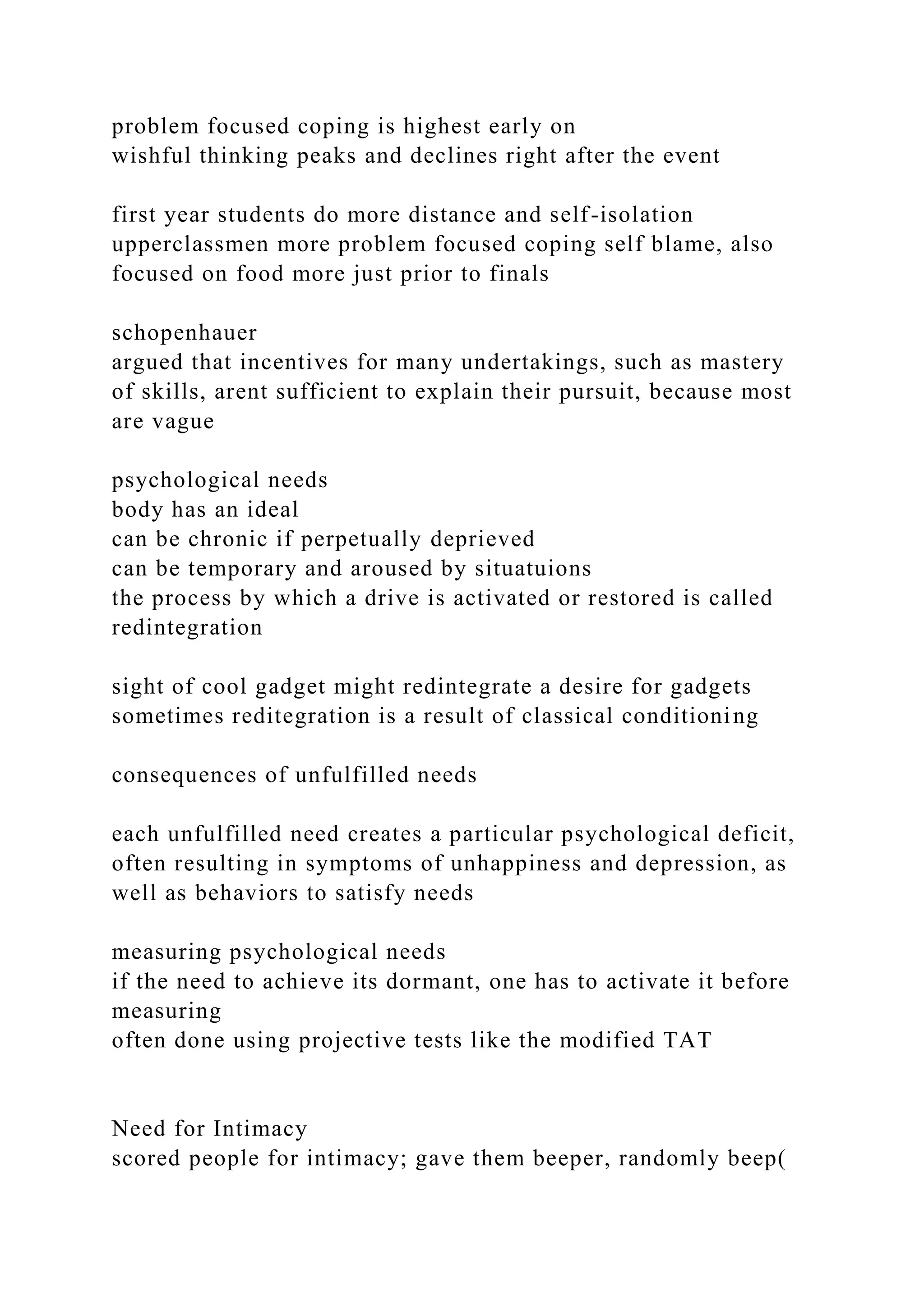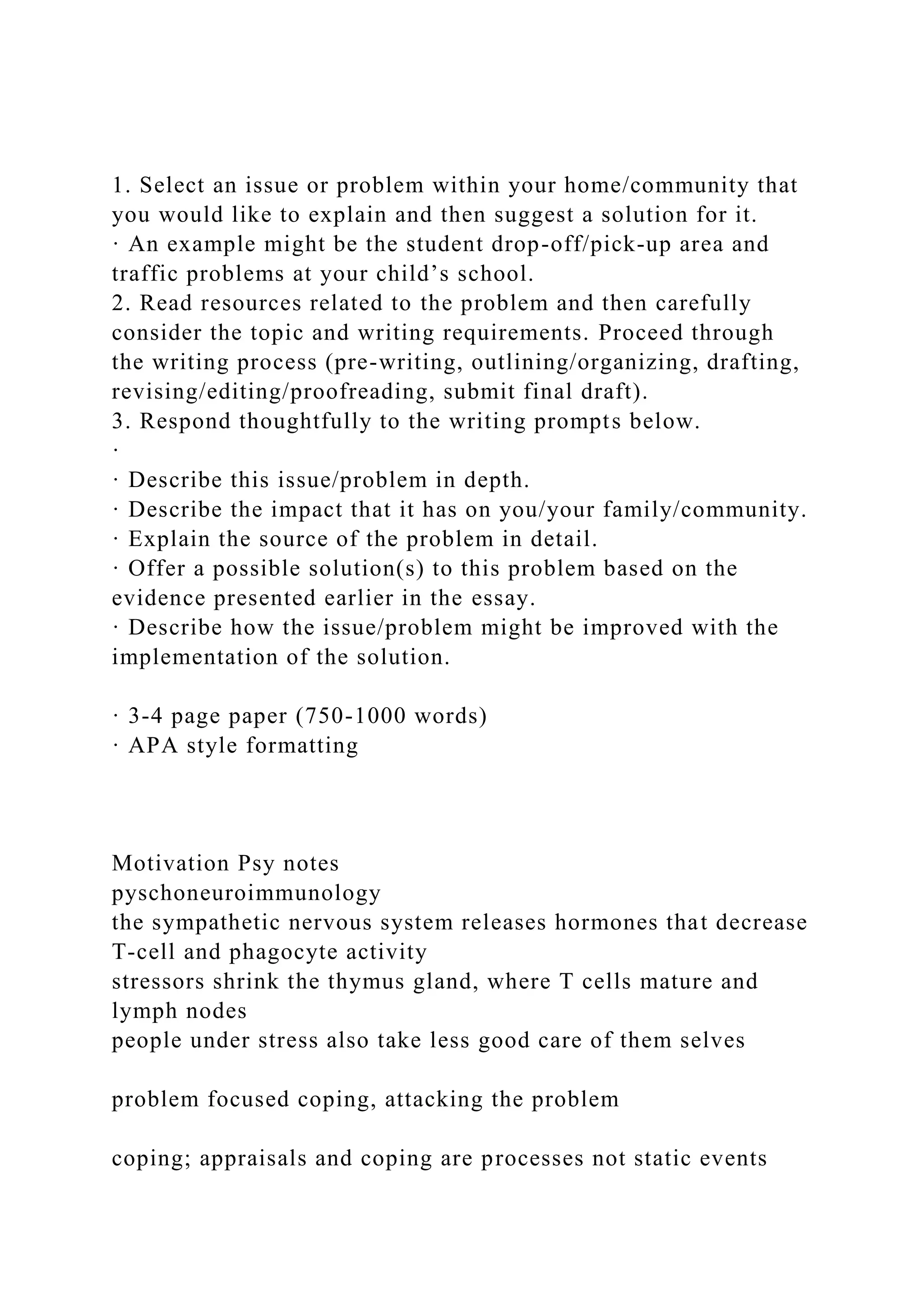 The document outlines a structured approach for writing about a community issue, including problem identification, impact analysis, and solution proposals. It also encompasses various psychological concepts such as coping strategies, personality traits, and the effects of stress and emotional needs on behavior. Additionally, it discusses sensation seeking, the effects of different personality traits on social interactions, and theories of mate selection and emotional bonding.