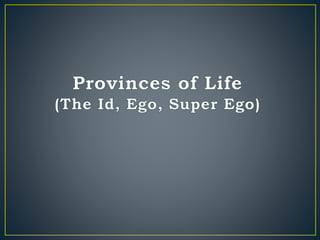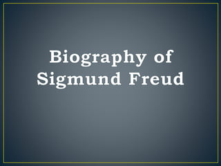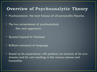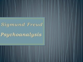 Sigmund Freud was a famous Austrian neurologist who founded psychoanalysis. Some key aspects of his theory include that mental life is divided into the conscious and unconscious minds. The unconscious contains drives and urges beyond our awareness, and can be revealed through dreams, slips of the tongue, and other mechanisms. Freud believed psychopathology arises from unconscious conflicts between the id, ego, and superego. He developed techniques like free association and analysis of transference to treat disorders like hysteria and neuroses. Psychoanalysis examines early childhood development and the influence of sexuality and aggression on personality formation.