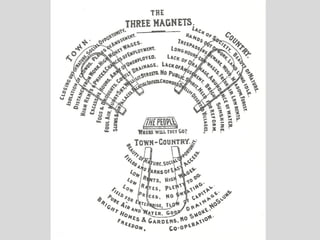 Urban and regional planning has evolved over time from ancient to modern eras. In ancient times, the first urban settlements emerged around 4000 BC along major river valleys and were characterized by large populations and monumental architecture. Many ancient cities practiced centralized planning. In medieval times, planning focused on fortifications and monasteries. The Renaissance period saw a rebirth of classical planning principles and emphasis on beautification of cities. The industrial revolution led to overcrowding and unsanitary conditions in cities. In response, planning movements emerged including the Garden City movement by Ebenezer Howard which advocated planned, self-contained communities surrounded by greenbelts. The City Beautiful movement emphasized grandeur and beautification of cities through axial