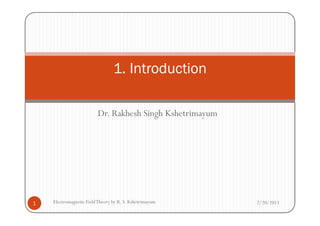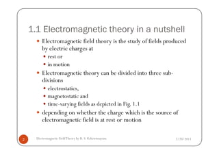 This document discusses electromagnetic field theory and computational electromagnetics. It introduces electromagnetic theory, which is divided into electrostatics, magnetostatics, and time-varying fields. Computational electromagnetics is presented as a way to numerically solve electromagnetic problems using computers. Different types of equation solvers are described, including integral equation solvers and differential equation solvers. General coordinate systems and transformations between coordinate systems are also covered.