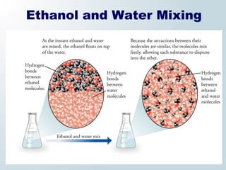 A solution is a homogeneous mixture of two or more substances. The substance that dissolves is called the solute and the substance it dissolves in is called the solvent. Solutions form through intermolecular forces between solvent and solute particles. The solubility of a substance depends on factors like temperature, pressure, and the polarity of the solvent and solute. Dissolving a solute involves breaking bonds in both the solute and solvent particles and forming new attractive interactions between solvent and solute particles.