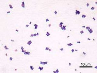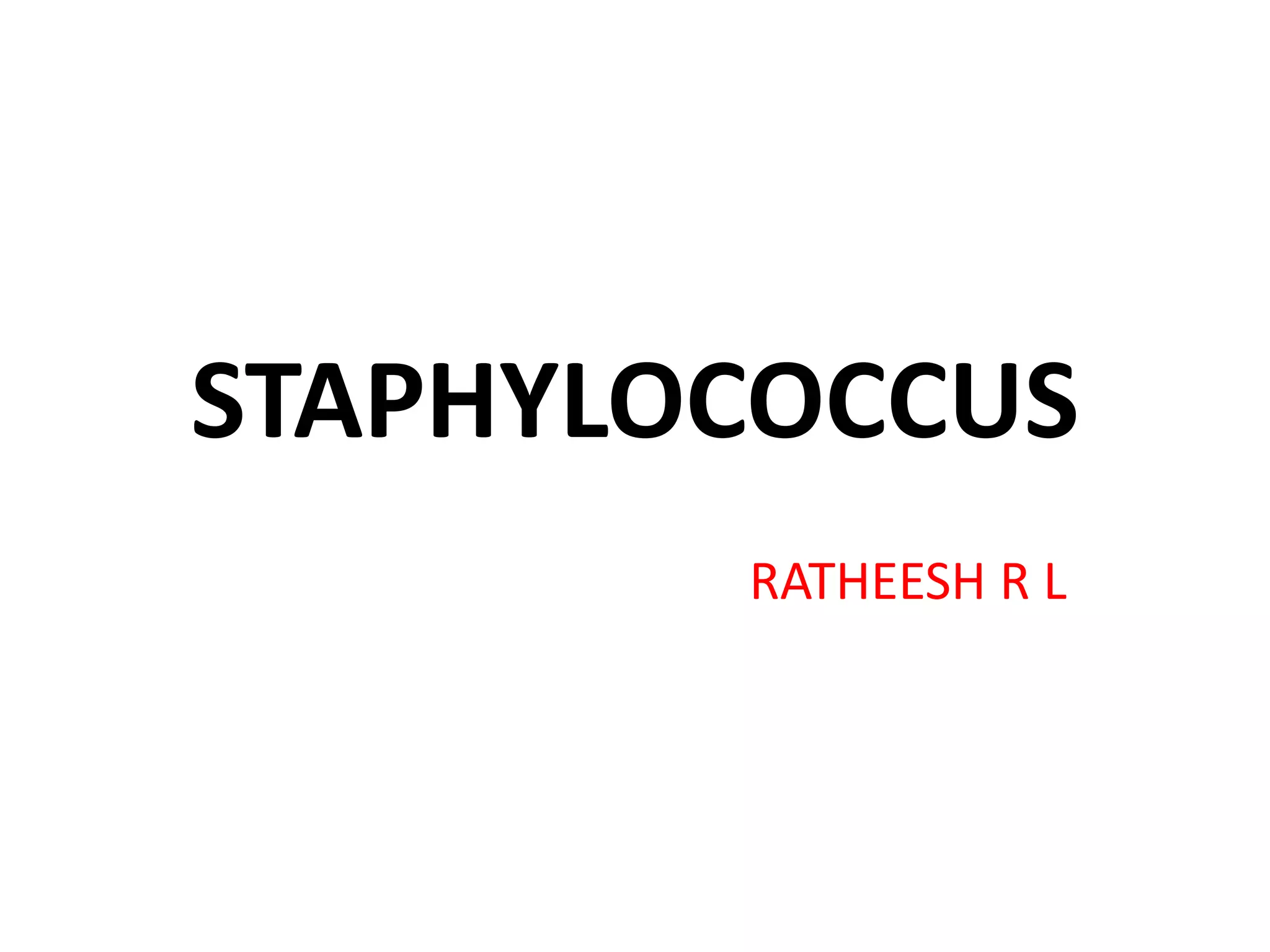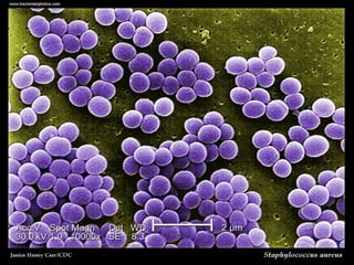 This document discusses Staphylococcus, including its morphology, cultural characteristics, pathogenicity, laboratory diagnosis, and treatment. Staphylococcus is a gram-positive, round bacterium that grows in clusters and produces golden yellow colonies on nutrient agar. It can cause both superficial and deep infections in humans and produces toxins that lead to conditions like toxic shock syndrome and scalded skin syndrome. Laboratory diagnosis involves examining samples under a microscope, culturing them on selective media, and identifying colonies using tests like coagulase. Effective antibiotic treatments include penicillin, methicillin, and vancomycin.
