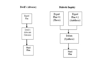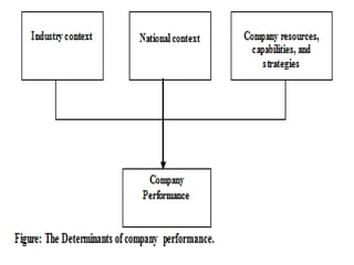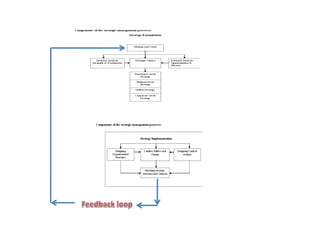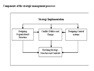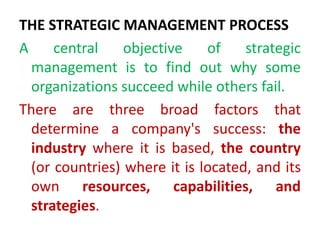 The document discusses the strategic management process. It describes the process as having five components: 1) selecting a mission and goals, 2) analyzing external opportunities and threats, 3) analyzing internal strengths and weaknesses, 4) choosing strategies to leverage strengths and opportunities, and 5) implementing strategies. It also discusses defining intended vs emergent strategies, and how companies can succeed through strategic intent rather than just fitting current capabilities to the environment.