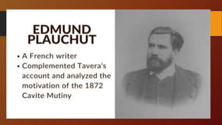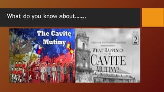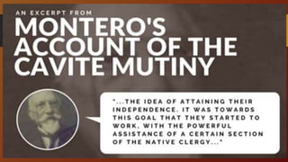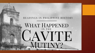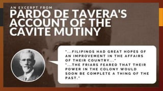 The Cavite Mutiny of 1872 was a significant event in Philippine history that highlighted tensions between Spanish colonial authorities and Filipino citizens. There are differing accounts of the mutiny and its causes. According to some Spanish perspectives, it was a large conspiracy among educated Filipinos, mestizos, and the native clergy to overthrow Spanish rule. However, other Filipino perspectives characterize it as a small-scale mutiny by dissatisfied workers and soldiers in response to the abolition of their privileges and harsh policies. The execution of three Filipino priests further inflamed nationalist sentiment. While the causes and scale of the mutiny are still debated, it is agreed that it marked an important step toward greater Filipino resistance and calls