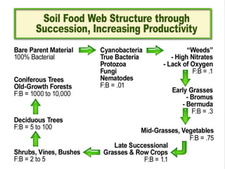 This document discusses the importance of soil health and holistic management for profitable ranching. It explains that soil food web structure and succession increase productivity over time. Different stages in the soil food web are described, from bacteria to forests. The tools of holistic management planning are outlined, including grazing, rest, technology, animal impact, fire, and living organisms. The progression from a simple to complex community with greater stability is depicted. Maintaining covered soil is emphasized as key to building soil structure, plant volume, and balanced populations.