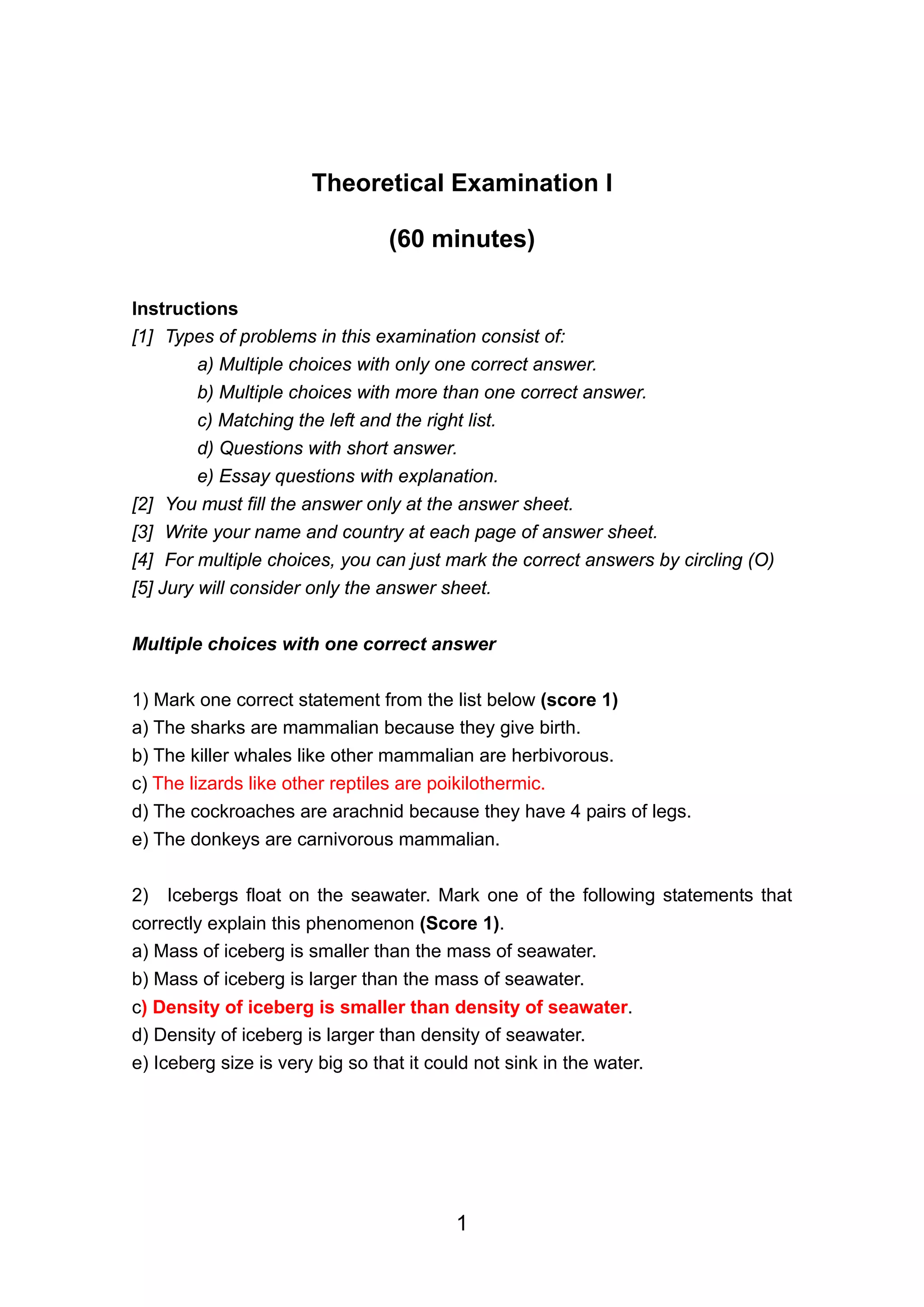 The document provides instructions for a theoretical examination consisting of multiple choice questions, matching questions, and short answer questions. It includes examples of different types of questions about biology, physics, and chemistry concepts. For multiple choice questions, students must select the single best answer or multiple correct answers depending on the question. The matching questions require connecting items from two lists. Short answer questions require brief explanations. Students must write their answers on an answer sheet, which is the only thing that will be graded.