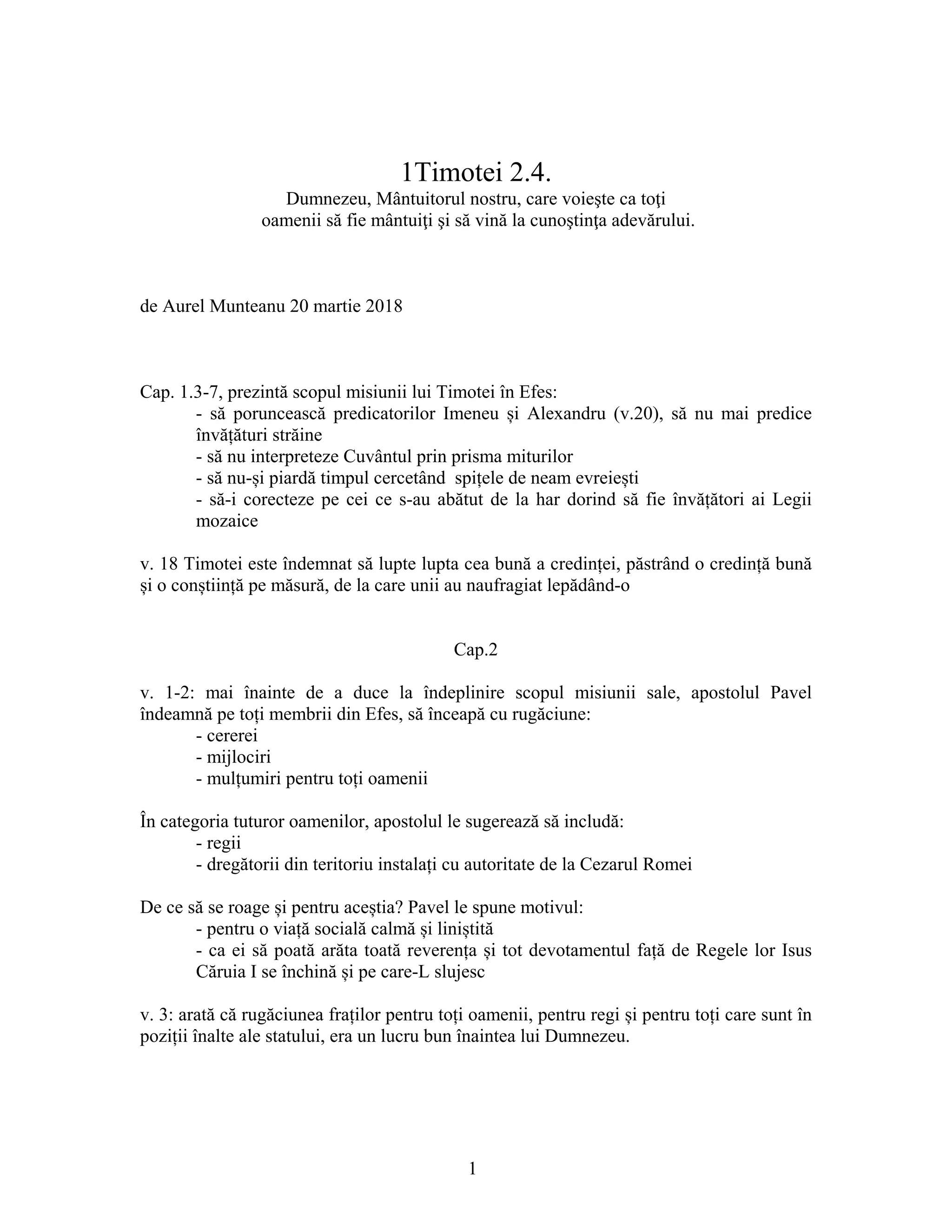 Documentul analizează misiunea lui Timotei în Efes, subliniind importanța imperativului apostolic de a respinge învățăturile străine și de a se ruga pentru toți oamenii, inclusiv conducătorii, pentru a asigura o viață socială calmă. În contextul persecuțiilor creștine, se evidențiază că Dumnezeu dorește mântuirea tuturor oamenilor, fără a face distincții sociale sau etnice. Rugăciunea pentru dușmani este încurajată ca un mod de a reflecta caracterul divin și a promova armonia în societate.