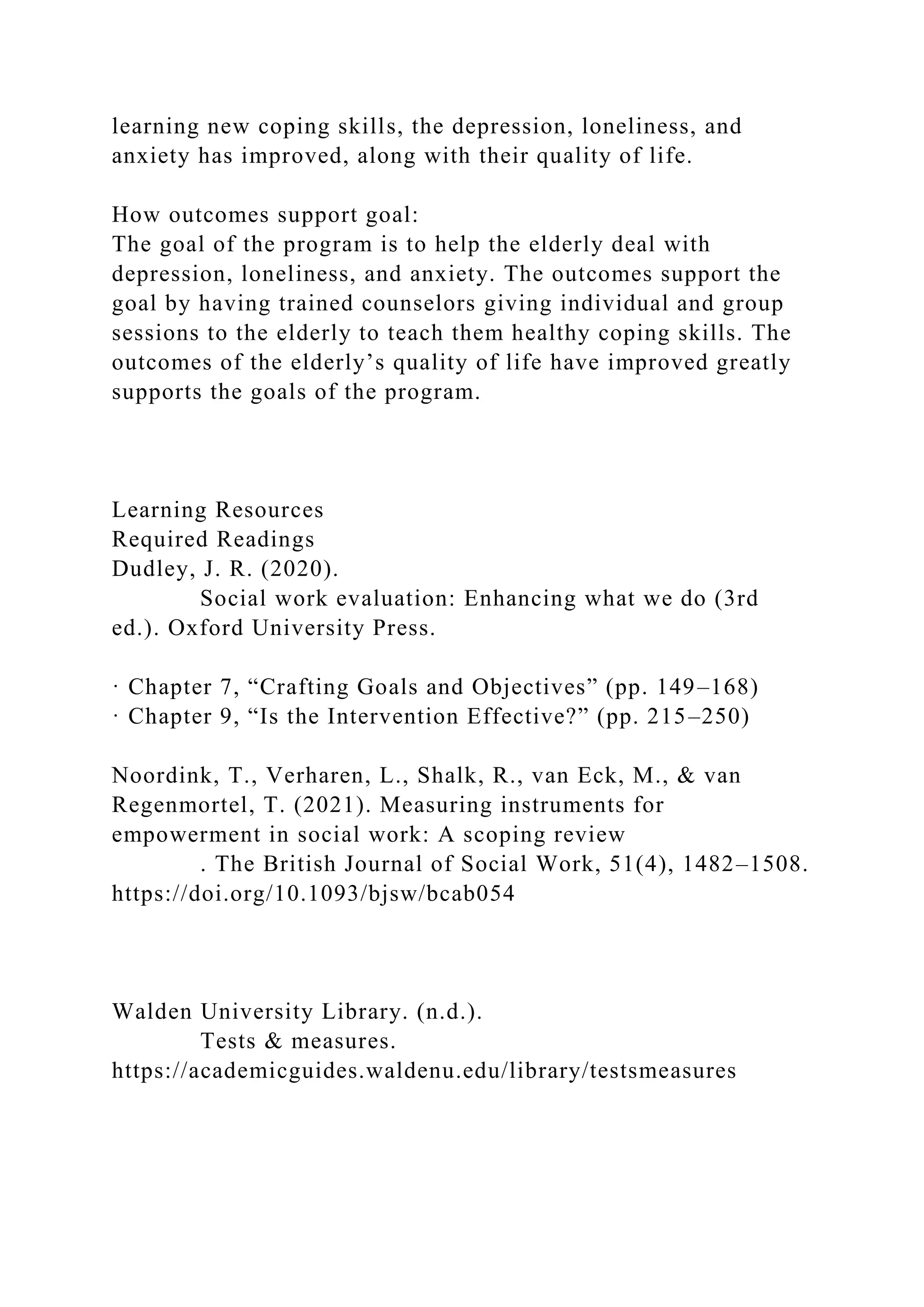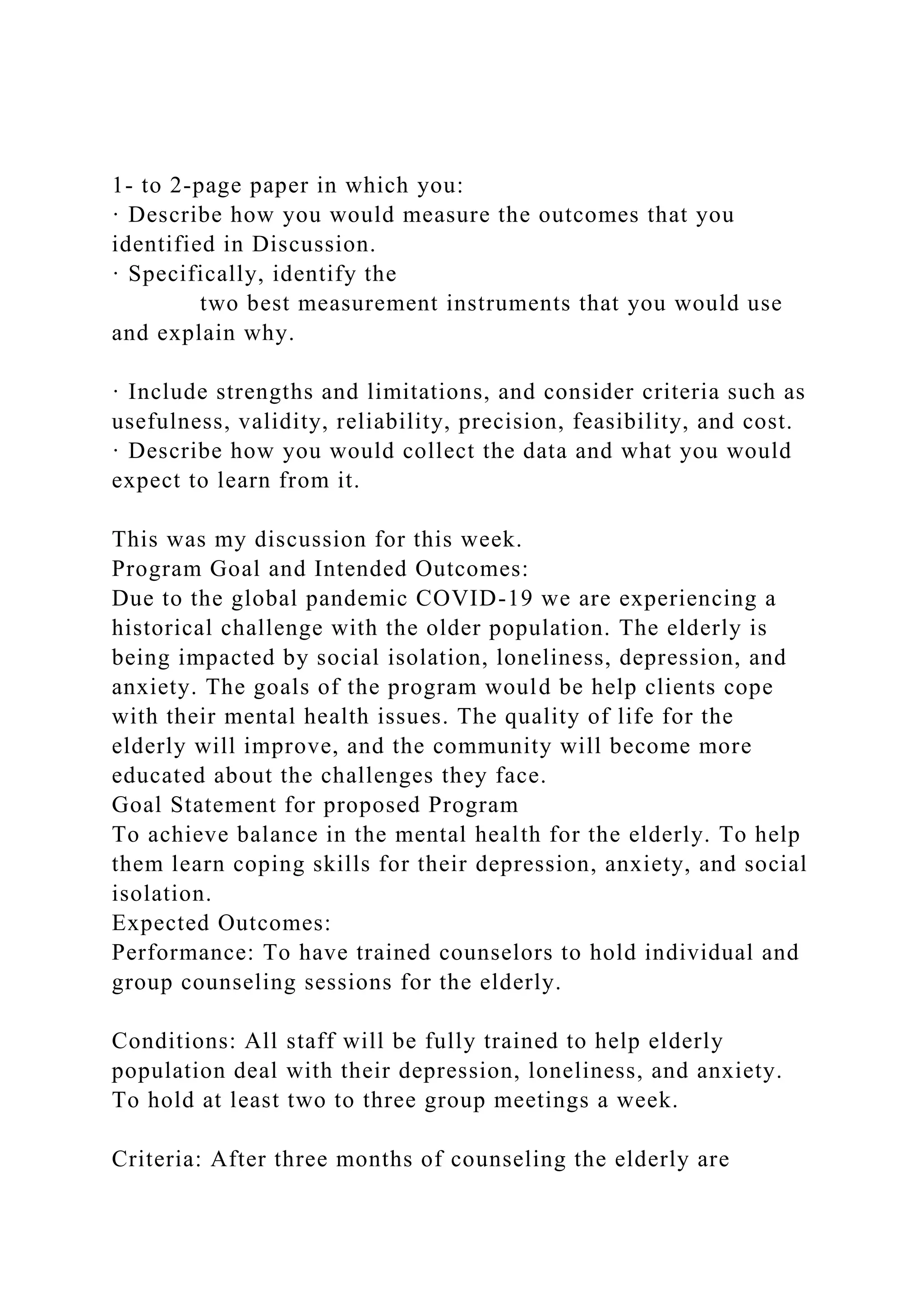 The document outlines a program aimed at improving the mental health of the elderly, particularly in light of challenges posed by social isolation during the COVID-19 pandemic. It discusses measurement of outcomes, identifies effective measurement instruments, and emphasizes the importance of support from trained counselors to help clients develop coping skills for issues like depression and anxiety. Additionally, it highlights the need for culturally responsive educational approaches for young children regarding race and gender, stressing the importance of creating a safe environment for discussions around diversity.