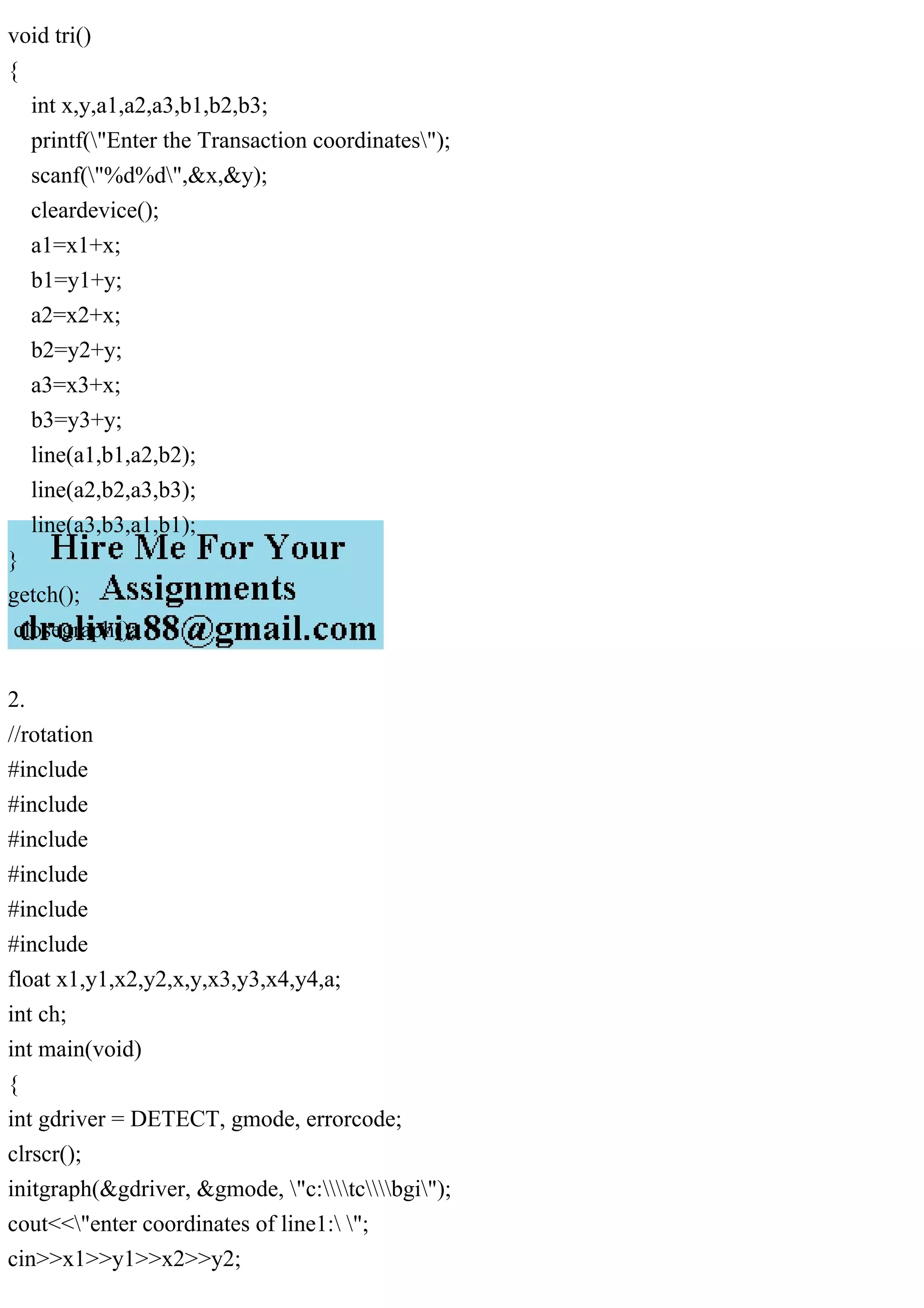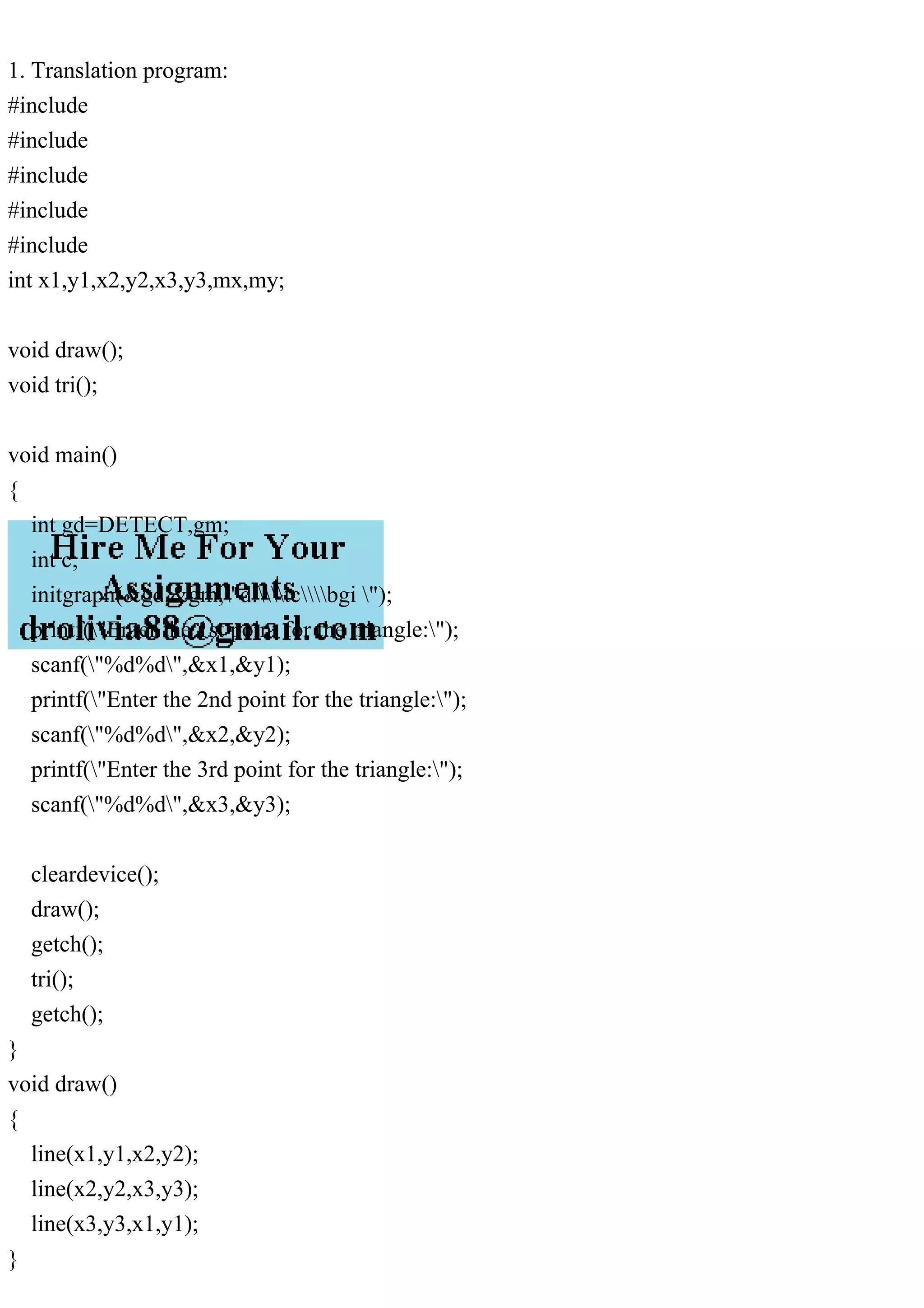The document contains C/C++ programs for basic geometric transformations: translation, rotation, and reflection of triangles. Each program prompts the user for triangle coordinates and transformation parameters, processes the input, and then visually displays the results using graphics functions. The structure includes initialization of graphics mode and main logic for performing the respective transformations based on user input.