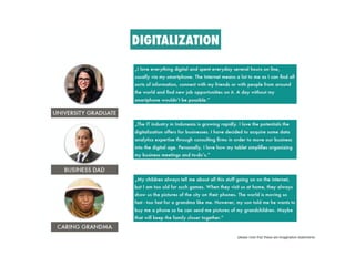 The document presents insights into digital trends in Indonesia as of March 2015, highlighting key statistics on internet and smartphone usage. It notes a significant population of internet users, primarily aged 12-34, and describes their online behaviors and habits, which include extensive mobile phone use in various situations. The findings indicate a shift in media consumption, particularly affecting print media, as more users turn to digital platforms.