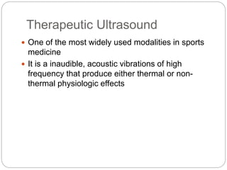 Therapeutic ultrasound is a commonly used modality in sports medicine that produces acoustic vibrations for thermal and non-thermal effects. It utilizes a transducer to convert electrical energy into ultrasound waves, affecting tissue depth and heating depending on frequency. Clinical applications include soft tissue healing, bone repair, and potential use in drug delivery through phonophoresis.