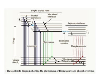 The document provides a comprehensive overview of fluorescence spectrophotometry, detailing the principles of luminescence, types of fluorescence (such as Stokes and anti-Stokes), and the factors affecting fluorescence intensity. It discusses the excited state processes in molecules, including collisional deactivation and intersystem crossing, and emphasizes how chemical structure and environmental conditions impact fluorescence. Additionally, it covers instrumentation used in fluorescence measurement and various applications across different fields.