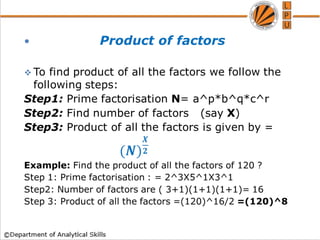 3) Factors and multiples, covering topics like finding the number of factors of a number and the sum of factors through examples.