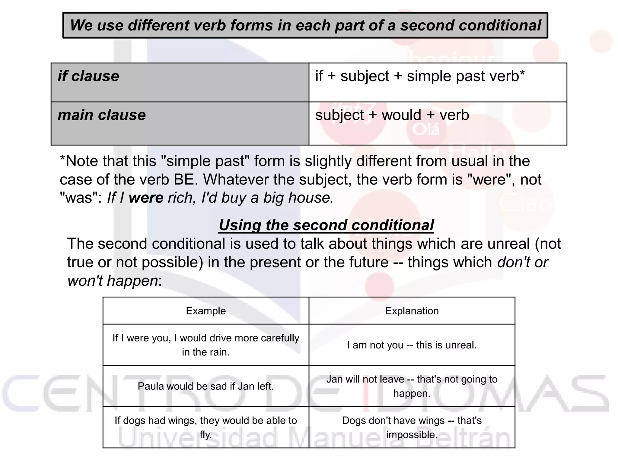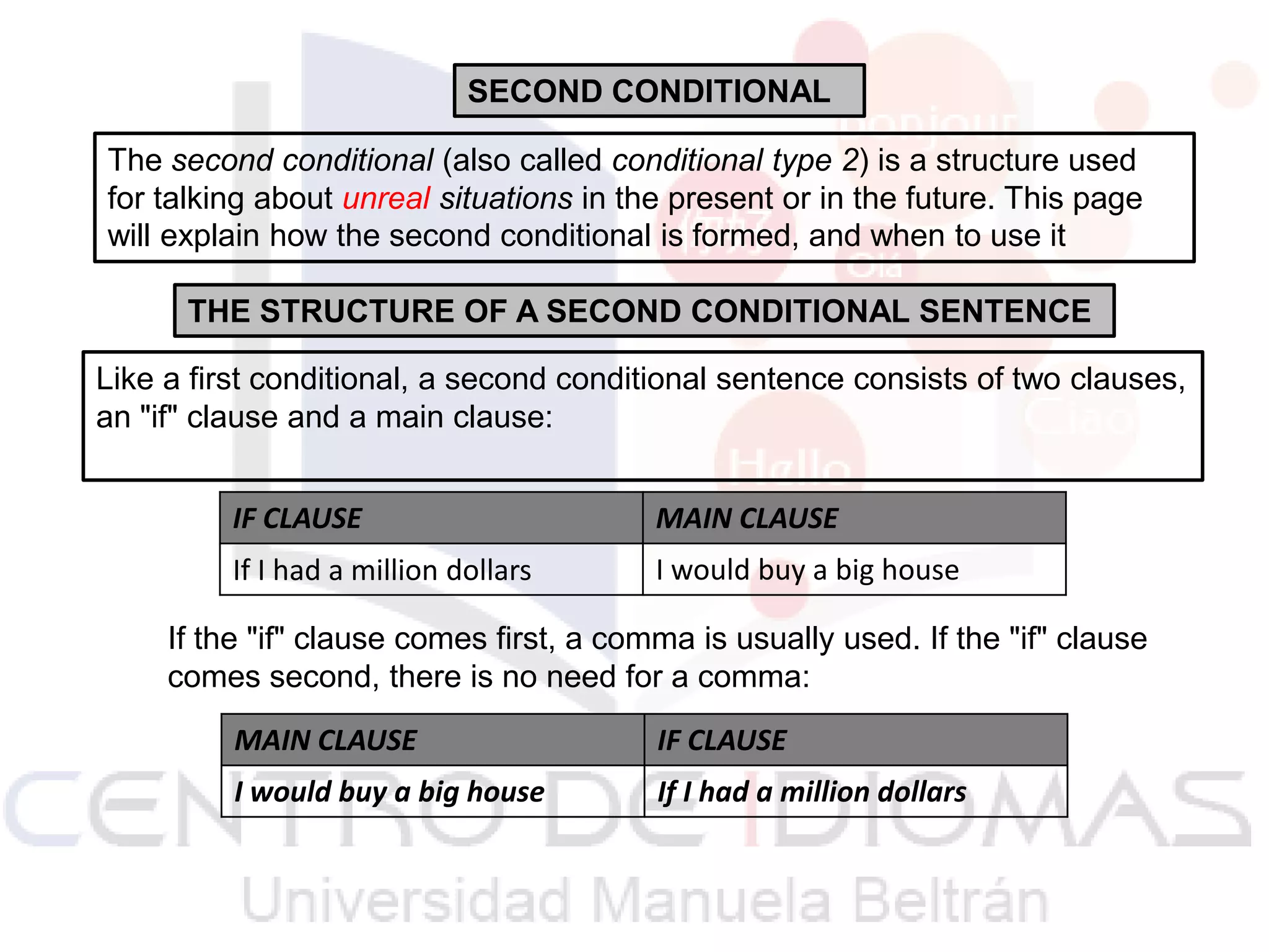 The document discusses the structure and use of second conditional sentences in English. It explains that second conditional sentences are used to talk about unreal or hypothetical situations in the present or future. The structure consists of an "if" clause using the past tense verb form followed by a main clause using "would" plus the base verb form. Examples are provided such as "If I had a million dollars, I would buy a big house" to illustrate talking about an unlikely present situation. The document also discusses using various time expressions like "when", "before", "after", "while" in adverb clauses and the tenses that should be used with each.