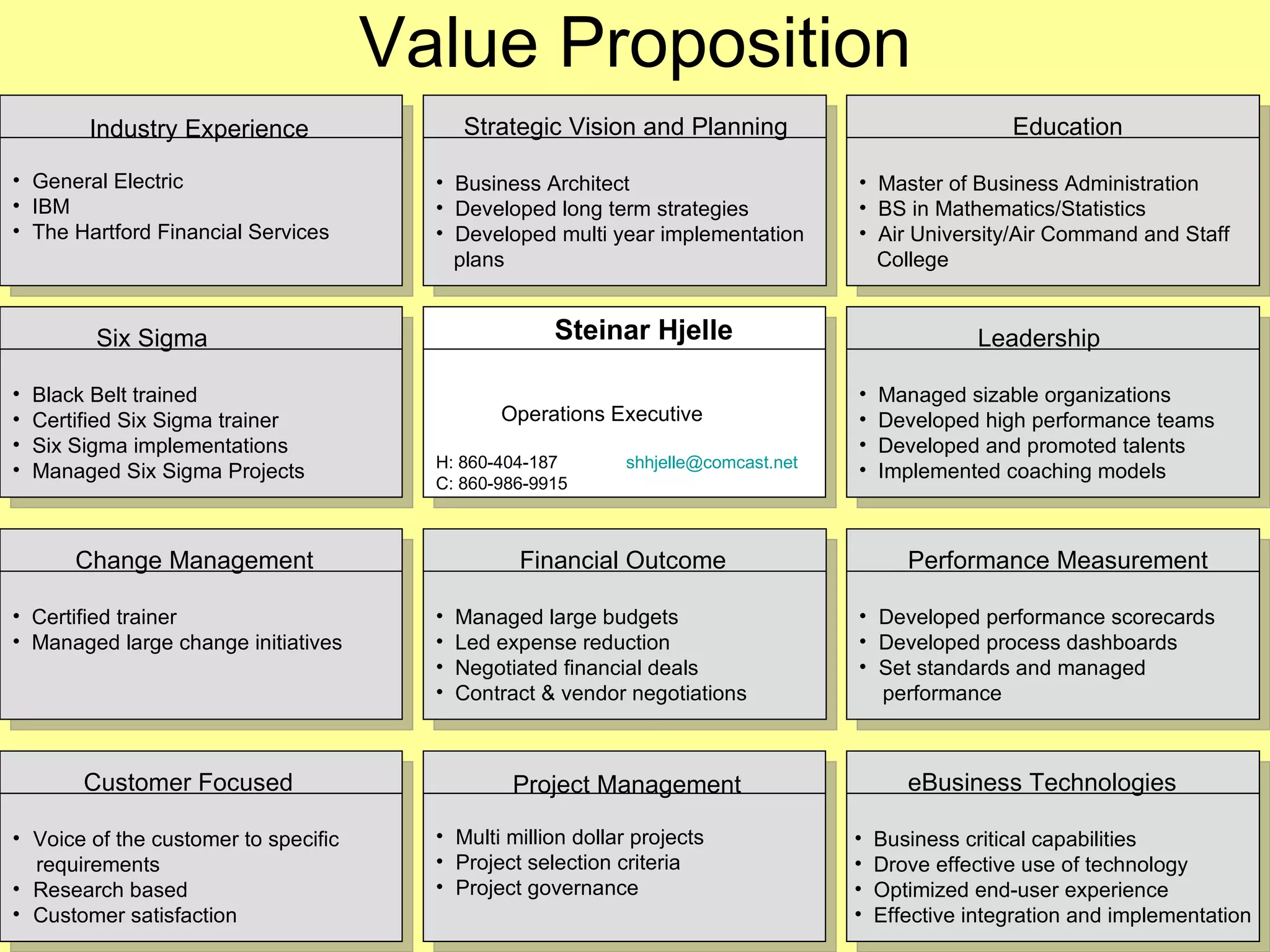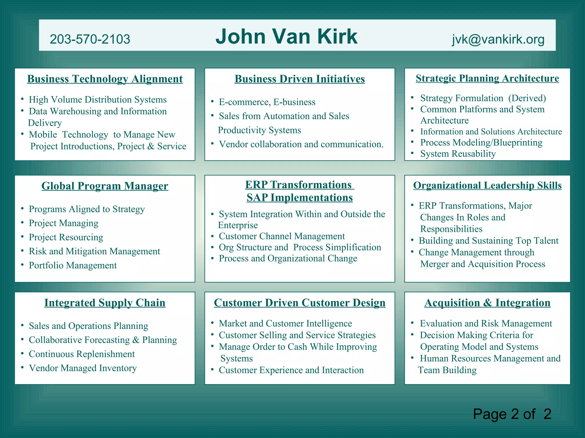 This document provides a summary of Ron Calabrese's experience and qualifications as an enterprise architect. He has expertise in areas such as architecture strategy, governance, standards, portfolio management, and ensuring alignment between business needs and IT solutions. His background demonstrates strong leadership skills and experience developing architectures for various industries.