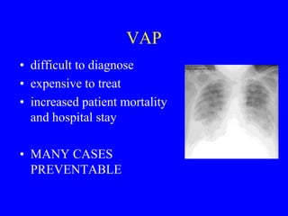 Ventilator-associated pneumonia (VAP) is difficult to diagnose and treat, prolongs hospital stays, increases mortality, and is expensive to manage. While up to 28% of ventilated patients may develop VAP, many cases are preventable through measures like hand hygiene, keeping patients semi-erect, minimizing sedation and intubation duration, and using specialized endotracheal tubes that allow subglottic suctioning of secretions. Proper diagnosis and early, targeted antibiotic treatment can improve outcomes for patients who do develop VAP.