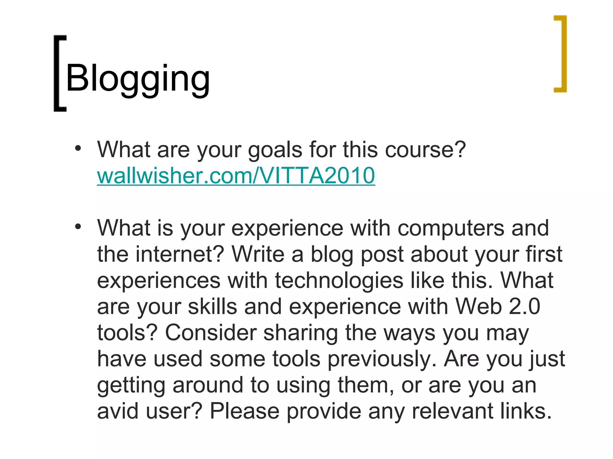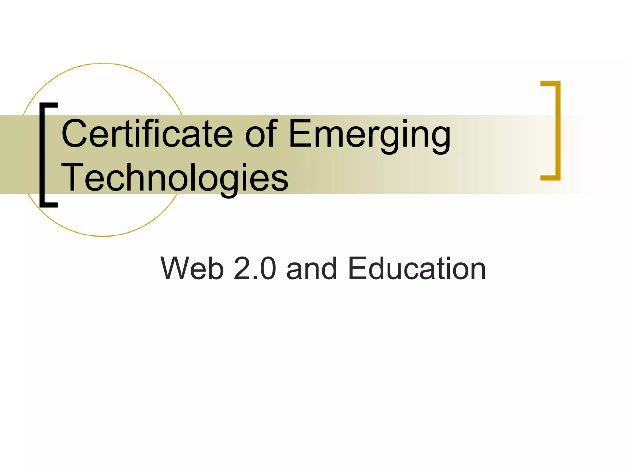 This document provides an overview of Web 2.0 tools for an emerging technologies course, including recommendations for using blogs, wikis, and Twitter. Students are asked to write blog posts about their experiences with technologies and Web 2.0 tools. A wiki and recommended readings on blogging and using new technologies are also listed. The document discusses personal learning networks and social bookmarking tools like Diigo. Links are provided about using Twitter for education and as a communication and search tool.