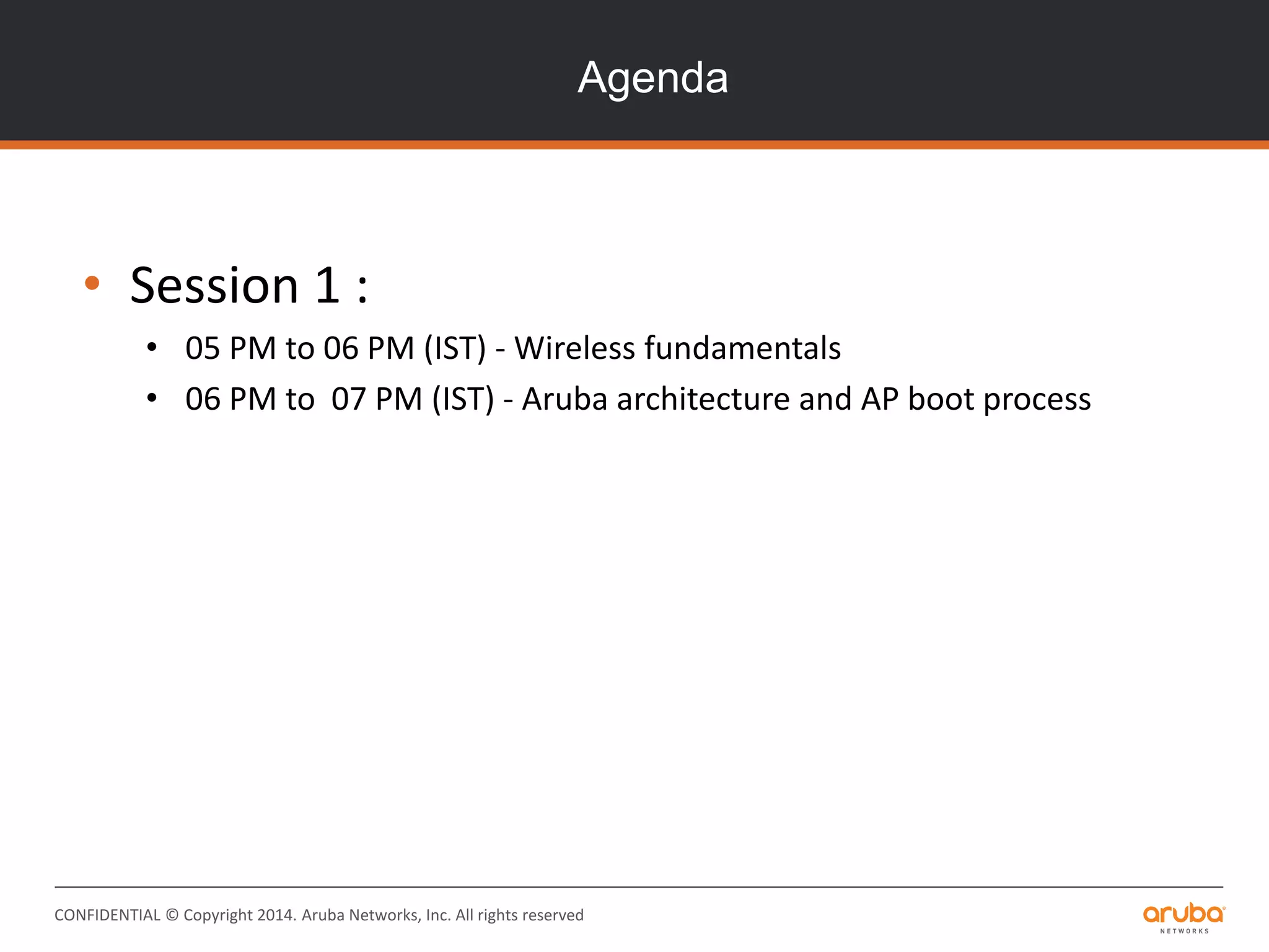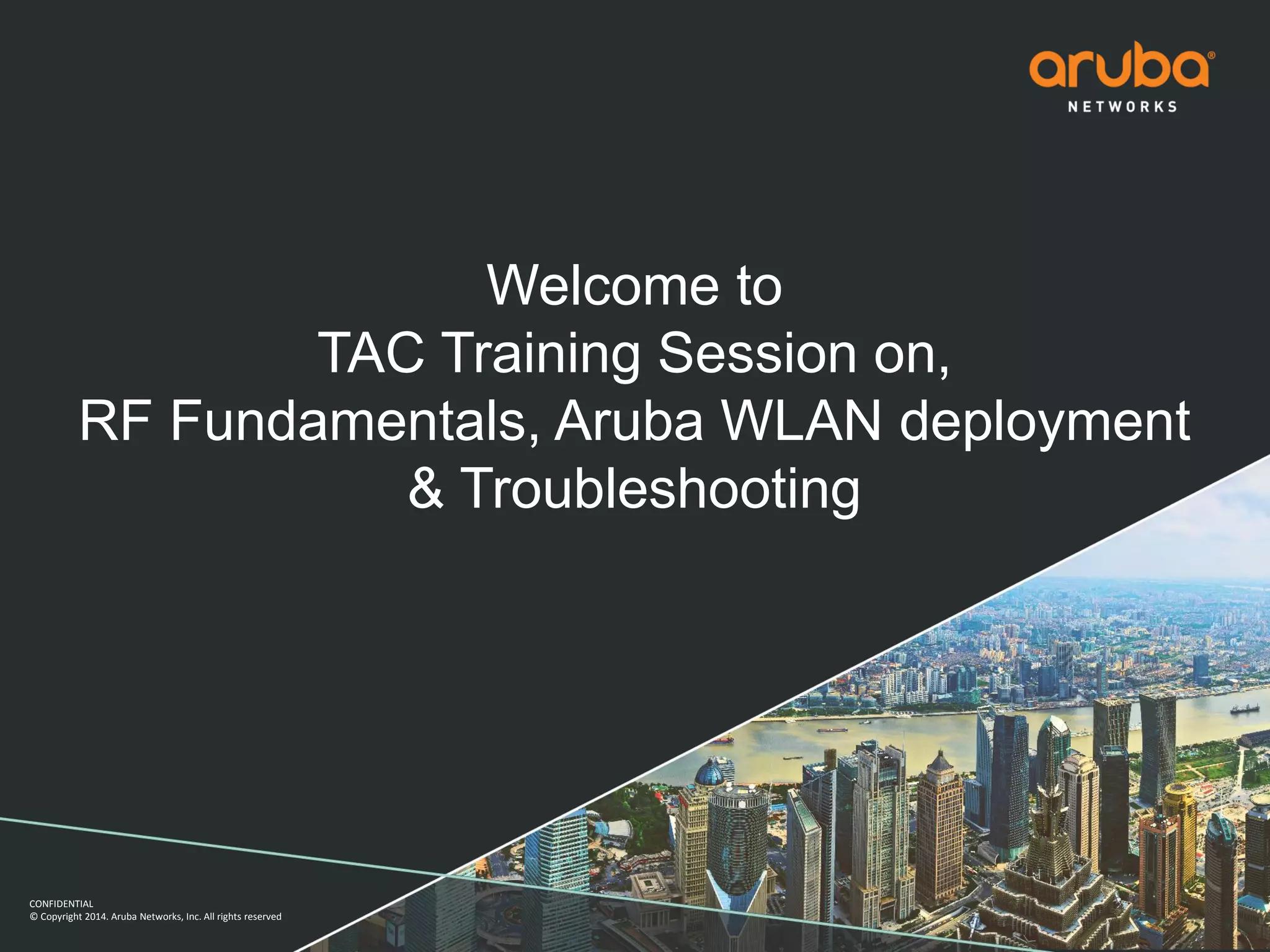The document is a training presentation on RF fundamentals, Aruba WLAN deployment, and troubleshooting. It covers topics like wireless standards 802.11n and 802.11ac, including their features like MIMO, channel bonding, wider channels, and higher data rates. It also discusses RF concepts like attenuation, multipath, and SNR. The presentation explains roaming types and processes. Aruba network architectures and AP boot processes are also mentioned.