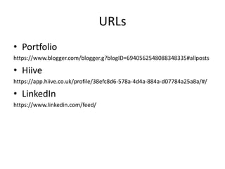 This document contains information about the author's work, including links to their portfolio and profiles on Hiive and LinkedIn. It also lists 3 job vacancies for 3D animation/rendering support, web content manager, and video editor roles along with the requirements. University courses studied are also included for film production, interactive media, and journalism/media with entry requirements. An action plan is outlined to complete media qualifications and ultimately work for the BBC or ITV.
