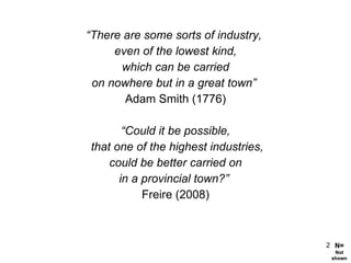 The document discusses the transformation of Frederikshavn through the lens of the 'experience economy' and its implications for entrepreneurship and local development. It examines challenges faced by the municipality, such as population decline and industrial changes, while highlighting initiatives like the Lysfestival and the development of renewable energy solutions. The study aims to analyze entrepreneurship dynamics and propose effective economic policies to leverage the experience economy for regional growth.