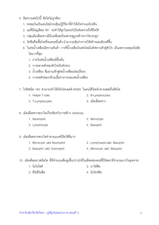 ภูมิคุมกันของรางกาย (ตอนที่ 1) 2 5. ขอความตอไปนี้ ขอใดไมถูกตอง 1. ทรอมบินเปนเอนไซมกระตุนปฏิกิริยาที่ทําใหเกิดรางแหโปรตีน 2. แมที่มีหมูเลือด Rh+ จะทําใหลูกในครรภเปนอันตรายถึงชีวิตได 3. กลุมเม็ดเลือดขาวมีนิวเคลียสเปนหลายพูถูกสรางจากไขกระดูก 4. วัคซีนคือเชื้อโรคที่หมดฤทธิ์แลว นํามากระตุนรางกายใหสรางแอนติบอดีขึ้น 6. ในทอน้ําเหลืองมีความดันต่ํา การที่น้ําเหลืองในทอไหลในทิศทางเขาสูหัวใจ เปนเพราะเหตุผลในขอ ใดมากที่สุด 1. ภายในทอน้ําเหลืองมีลิ้นคั่น 2. การคลายตัวของหัวใจเปนจังหวะ 3. น้ําเหลือง ซึมผานเขาสูทอน้ําเหลืองฝอยเรื่อยๆ 4. การหดตัวของกลามเนื้อรางกายรอบทอน้ําเหลือง 7. ไวรัสชนิด HIV สามารถทําใหเกิดโรคเอดส (AIDS) ในคนไดโดยทําลายเซลลในขอใด 1. Helper T cells 2. B-Lymphocytes 3. T-Lymphocytes 4. เม็ดเลือดขาว 8. เม็ดเลือดขาวพวกใดเกี่ยวของกับการสราง Antibody 1. Neutrophil 2. Monoclyte 3. Lymphocyte 4. Basophil 9. เม็ดเลือดขาวพวกใดทําลายแบคทีเรียไดดีมาก 1. Monocyte และ Neutrophil 2. Lymphoayte และ Basophil 3. Basophil และ Eosinophil 4. Monocyte และ Basophil 10. เม็ดเลือดขาวชนิดใด ที่มีจํานวนเพิ่มสูงขึ้นกวาปกติในเลือดของคนที่มีไขพยาธิจํานวนมากในอุจจาระ 1. โมโนไซต 2. บาโซฟล 3. อีโอซิโนฟล 4. นิวโทรฟล