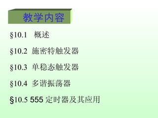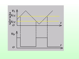 注意:工作中不使用 V CO时,一般都通过一个 0.01μF 的电容接地 ( 交流接地),以旁路高频干扰。 当 V CO 悬空时, V R1 =2/3 V cc , V R2 =1/3 V cc ★ 比较器 C 1 输出 v C1 =0, 比较器 C 2 输出 v C2 =1 , SR 锁存器置 0 , T D 导通,同时 v O 为低电平。 0 1 0 1 0 比较器 C 1 输出 v C1 =1, 比较器 C 2 输出 v C2 =1 , SR 锁存发器状态保持不变, T D 和 v O 均保持不变。 1 1 比较器 C 1 输出 v C1 =1, 比较器 C 2 输出 v C2 =0 , SR 锁存器置 1 , T D 截止,同时 v O 为高电平。 1 0 1 0 1 比较器 C 1 输出 v C1 =0, 比较器 C 2 输出 v C2 =0 , SR 锁存器违反约束条件,输出为 1 , T D 截止。 0 0 1 0 1