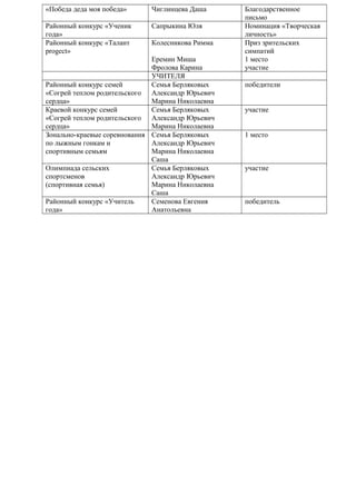 В документе представлены достижения педагогов и учащихся Моу "Тогульская средняя общеобразовательная школа" за 2010-2011 учебный год, включая различные конкурсы и фестивали. Учащиеся получили дипломы и грамоты за призовые места в конкурсах рисунков, авторской песни и литературных работ. Также отмечены успехи семей в соревнованиях и конкурсах, включая лыжные гонки.