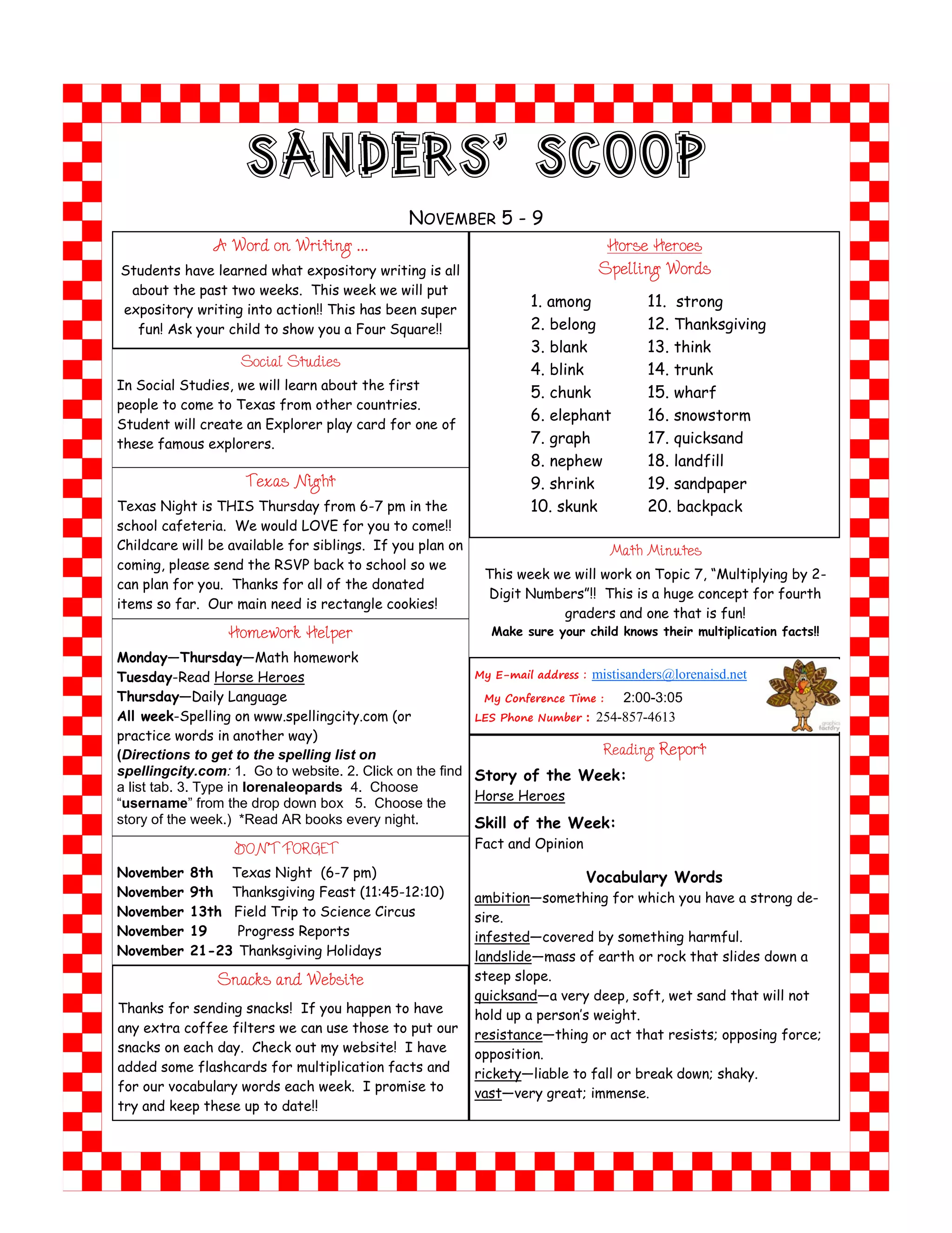 This weekly update provides information for students and families about the upcoming week of November 5-9. Key events and lessons included exploring Texas explorers in social studies, a Texas Night event on November 8th, and multiplying 2-digit numbers in math. The document encourages practicing multiplication facts and provides contact information for the teacher.