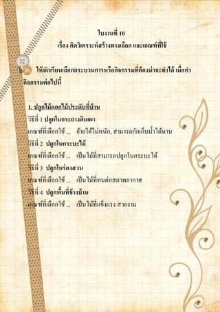 เรื่อง คิดวิเคราะห์ สร้ างทางเลือก และเกณฑ์ ทใช้ ี่ ให้ นักเรียนเลือกกระบวนการหรือกิจกรรมทีต้องน่ าจะทาได้ เมือทา ่ ่ กิจกรรมต่ อไปนี้ 1. ปลูกไม้ ดอกไม้ ประดับทีบ้าน ่ วิธีที่ 1 ปลูกในกระถางดินเผา เกณฑ์ที่เลือกใช้ ... ย้ายได้ไม่หนัก, สามารถกักเก็บน้ าได้นาน วิธีที่ 2 ปลูกในกระบะไม้ เกณฑ์ที่เลือกใช้ ... เป็ นไม้ที่สามารถปลูกในกระบะได้ วิธีที่ 3 ปลูกในร่ องสวน เกณฑ์ที่เลือกใช้ ... เป็ นไม้ที่ทนต่อสภาพอากาศ วิธีที่ 4 ปลูกพืนทีข้างบ้ าน ้ ่ เกณฑ์ที่เลือกใช้ ... เป็ นไม้ที่แข็งแรง สวยงาม