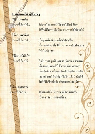 นาน ๆ วิธีที่ 1 ดองเค็ม เกณฑ์ที่เลือกใช้ ... ใส่ ขวดโหล และนาไปวางไว้ในที่ลบตา ั ใช้พ้ืนที่ในการเก็บน้อย สามารถนาไปขายได้ วิธีที่ 2 แดดเดียว เกณฑ์ที่เลือกใช้ ... เนื้อบูดหรื อเสี ยง่าย ก็นาไปทาเป็ น เนื้อแดดเดียว เก็บได้นาน เวลาจะรับประทาน ก็นาไปปรุ งสุ ก วิธีที่ 3 หมักในไห เกณฑ์ที่เลือกใช้ ... สิ่ งที่นามาปรุ งเป็ นอาหาร เช่น ปลา สามารถ เก็บรับประทานไว้ได้นานๆ ด้วยการหมัก เพื่อเก็บรักษาเนื้อของปลาไว้ รับประทานใน เวลาแล้ง หมักในโอ่ง หรื อไห แล้วนาเว็บไว้ ในที่ท่ีมิดชิดเพื่อป้ องกันหนอนแมลงวัน วิธีที่ 4 ดองหวาน เกณฑ์ที่เลือกใช้ ... ั ใช้กบผลไม้ที่รับประทานไม่หมดแล้ว เป็ นผลไม้ที่มีรสชาติเปรี้ ยว