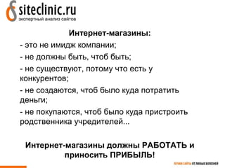 Доклад Юрия Кушнерова на конференции 'Интернет-магазины Украины 2012' обсуждает причины неэффективности интернет-магазинов и предлагает решения для привлечения клиентов и увеличения продаж. Основные проблемы включают плохую видимость сайта, неверные рекламные стратегии, недостаточное качество юзабилити, запутанные условия покупки и отсутствие работы с клиентами после покупки. Доклад акцентирует внимание на важности управления репутацией и анализе конкурентных цен для успешной работы интернет-магазина.