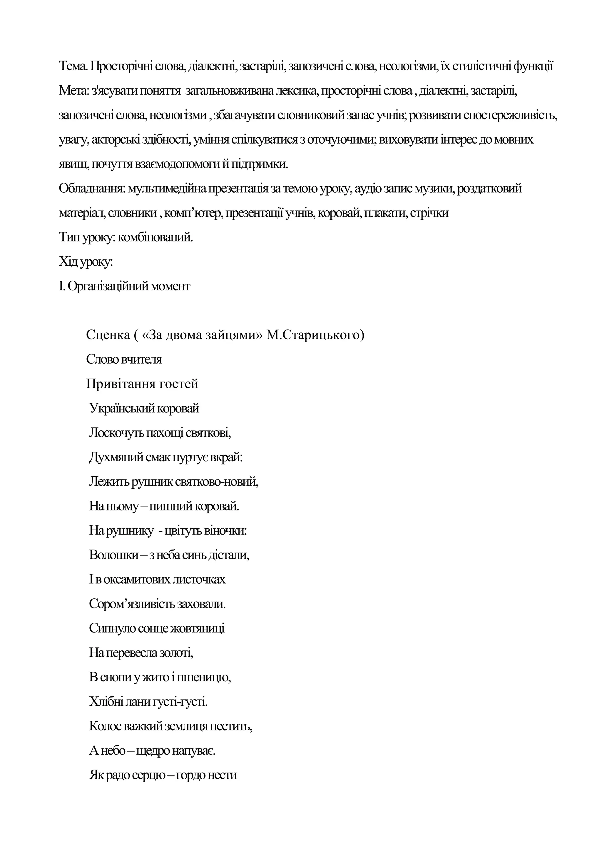 матеріал, словники , комп’ютер, презентації учнів, коровай, плакати, стрічки