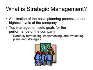 Strategic management involves top management setting long-term goals for the company and developing strategic plans to achieve these goals. It includes three key phases - formulation, implementation, and evaluation. In the formulation phase, strategies are developed by analyzing the company's strengths, weaknesses, opportunities, and threats. The implementation phase involves executing the strategies. In the evaluation phase, the strategies and plans are continuously monitored and updated based on performance and changes in the internal and external environment.
