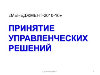 Документ описывает различные методы принятия управленческих решений, акцентируя внимание на групповых и индивидуальных подходах, а также творческих и аналитических методах. Характеризуются методы мозговой атаки и другие инструменты, используемые для генерации идей и улучшения процесса принятия решений. Обсуждается важность выбора подходящего метода, а также влияние человеческого потенциала на эффективность решения.