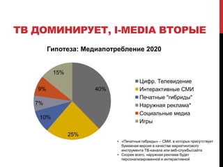 Документ обсуждает эволюцию медиа с 1910 по 2020 год, подчеркивая переход от традиционных форм к интерактивным и цифровым каналам, а также затрагивает влияние социальных медиа на потребление контента. Указывается, что телевидение останется основным медиа-каналом, а традиционные СМИ столкнутся с кризисом и необходимостью адаптации к новым условиям. Приводится рекомендация для профессионалов в медиа развивать навыки и ориентироваться на предпочтения аудитории, а не на требования редакторов.