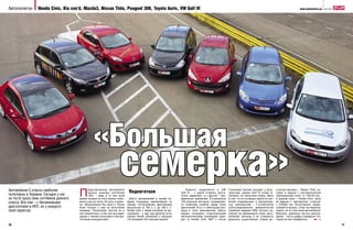 Документ представляет обзор тестирования семи хэтчбеков с-класса, включая Honda Civic, Kia Cee'd, Mazda3, Nissan Tiida, Peugeot 308, Toyota Auris и VW Golf VI. Основное внимание уделяется динамике, комфорту, оснащению и ценовым категориям этих автомобилей, при этом Civic и Cee'd проявили себя как сильные участники теста. Цены на тестируемые автомобили варьируются значительно, что определяет предпочтения потребителей в зависимости от функциональности и характеристик.