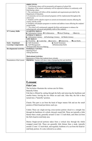 The document outlines a learning plan for technology and livelihood education for Grade 10 at Cavite Community Academy, focused on preparing fish and shellfish. It details the curriculum objectives, session activities, and various fish cuts, while also emphasizing the school's vision, mission, and goals related to holistic development and community responsibility. The assessment will include visual aids and practical engagement to reinforce learning outcomes.