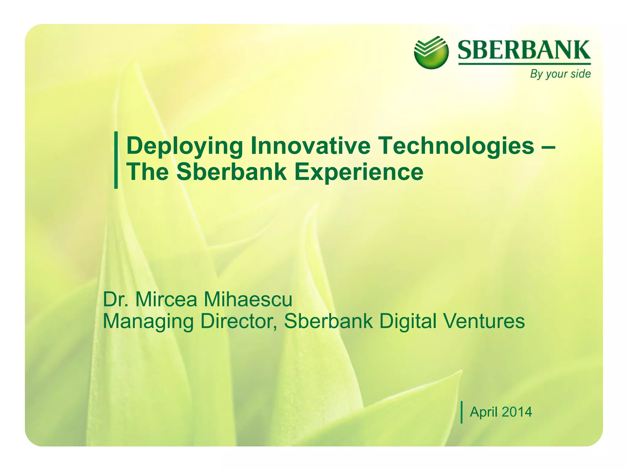 This document discusses Sberbank's approach to deploying innovative technologies. It outlines Sberbank's technology innovation strategy, activities, and management model. The strategy involves monitoring technology trends, exploring new ideas through pilots, and demonstrating potential solutions. Sberbank manages a portfolio of innovation projects and assesses their maturity, value gaps, and alignment with strategic initiatives. The document provides templates for tracking innovation projects and managing the project portfolio. It also discusses potential derailment factors for technology innovation efforts.