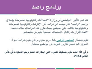 تستعرض الوثيقة برنامج "راصد" الذي أطلقته وزارة تكنولوجيا المعلومات والاتصالات لدراسة تأثير التكنولوجيا والمعلومات على المجتمع. يتضمن البرنامج إصدار تقارير شهرية وربع سنوية عن سوق التقنية والتكنولوجيا الجديدة، خصوصاً خلال كأس العالم 2014، ويشمل Innovations مختلفة مثل تطبيقات ووسائل تكنولوجية مخصصة لتحسين تجربة المشجعين.