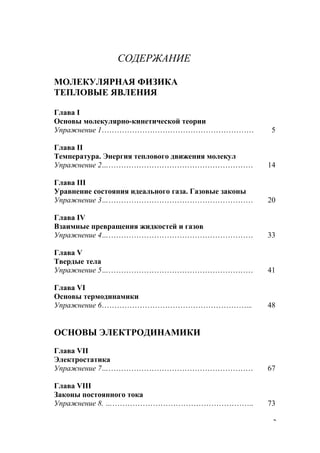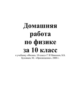 Документ представляет собой домашнюю работу по физике для 10 класса к учебнику «Физика, 10 класс» авторов Мякишева и Буховцева. В нем содержится содержание, включая главы о молекулярной физике, термодинамике, электродинамике и газовых законах, а также ряд задач и лабораторных работ, проиллюстрированных примерами вычислений и решением физических задач. Основное внимание уделено понятиям, связанным с молекулярной кинетической теорией, состоянием газов и их свойствам.