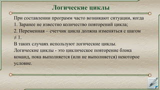 Документ описывает алгоритмы с повторениями и операторы циклов на языке программирования, включая логические циклы, вложенные циклы и примеры их использования. Приводятся различные примеры программ на Pascal, включая задачи на нахождение чисел, решения уравнений и контроль ввода данных. Основное внимание уделяется различиям между циклами while и repeat, а также важности изменения переменных в теле циклов.