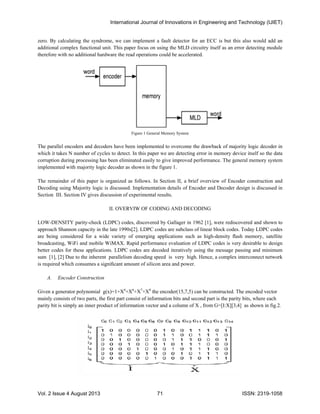 - An encoder and parallel majority logic decoder for a (15,7,5) EG-LDPC code were implemented in Verilog on FPGA.