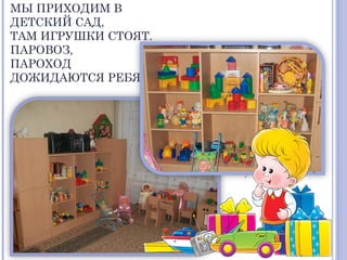 Документ описывает детский сад, в котором царит порядок и чистота, создающие комфортную обстановку для детей. Упоминается наличие развивающих игрушек и важность информирования родителей о распорядке дня. В целом, акцент сделан на воспитании и развитии детей в безопасной и экологически чистой среде.