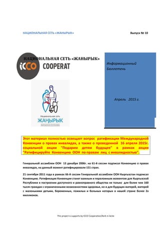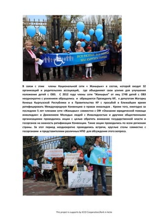 Документ освещает усилия по ратификации международной конвенции о правах инвалидов в Кыргызстане и действия национальной сети «Жанырык» по привлечению внимания к этой проблеме. В ходе социальных акций, круглых столов и обращений к государственной власти поднимались вопросы прав лиц с инвалидностью и необходимости создания условий для их равноправного участия в обществе. Были собраны более 5000 подписей за ратификацию конвенции, однако существует мнение, что без соответствующих законодательных изменений и финансирования проблемы не будут решены.