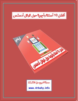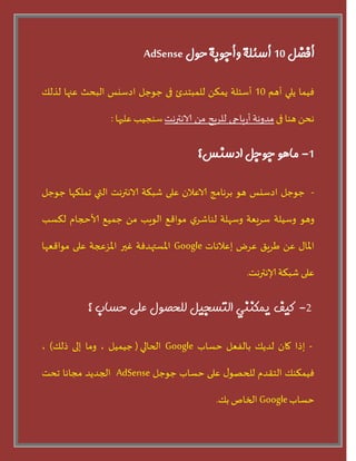 يتناول الوثيقة أهم 10 أسئلة شائعة حول عملية التسجيل واستخدام أدسنس في إعلانات جوجل، بالإضافة إلى كيفية الربح من الإعلانات. تشمل الأسئلة مواضيع مثل كيفية التسجيل، كيفية التأكد من الموافقة على الحساب، وآلية الدفع. كما يجاب على استفسارات حول الشرعية ومعايير النجاح المرتبطة بأدسنس.